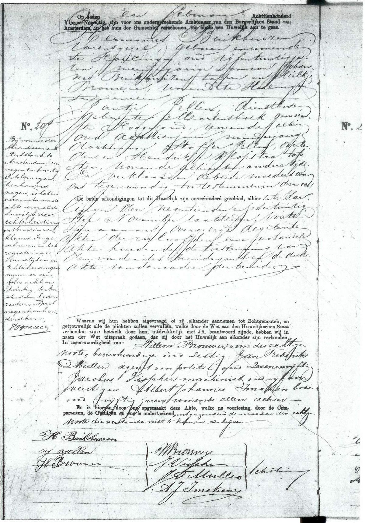 Getuigen: Willem Brouwer, 60 jr, bouwkundige, oom des echtgenoots; Jan Frederik