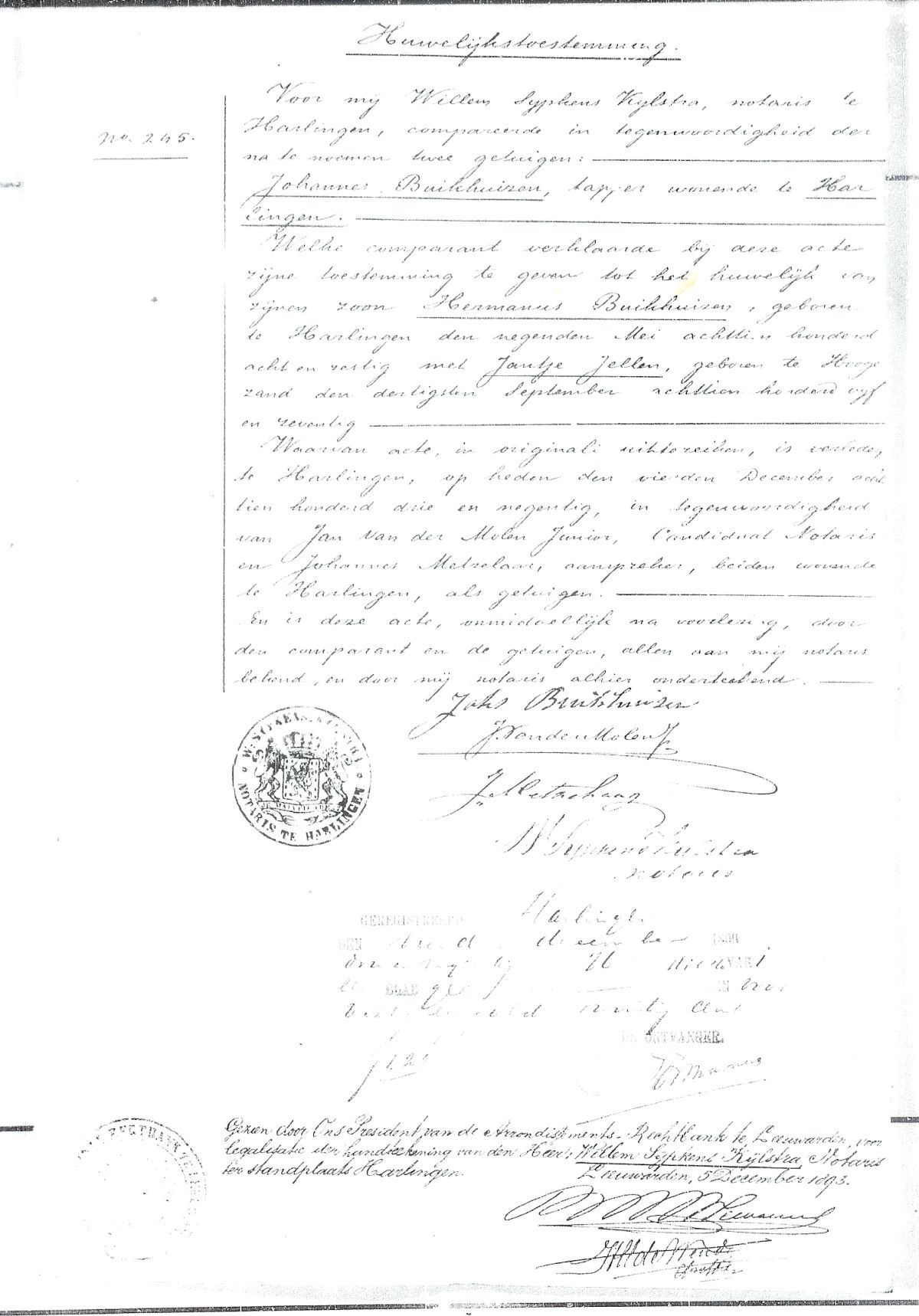 Akte (nr 245)van huwelijkstoestemming 04-12-1893, Gem. Harlingen - bijlage huwelijks akte