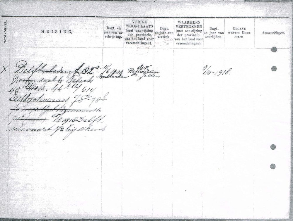 Zij kwam op 11-06-1909 van Amsterdam en woonde hier op de Delftschevaart 82a.