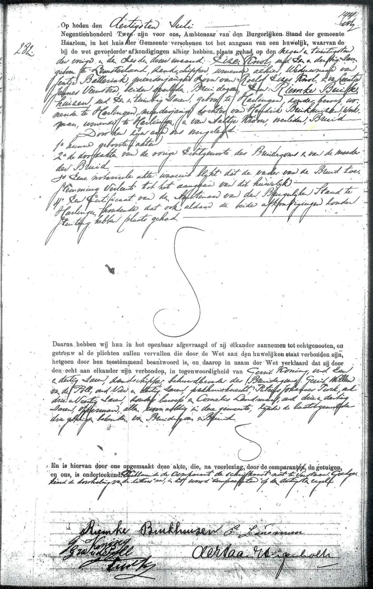 Huwelijks register 1902, Haarlem - archief Haarlem, folio 144 - blad 282