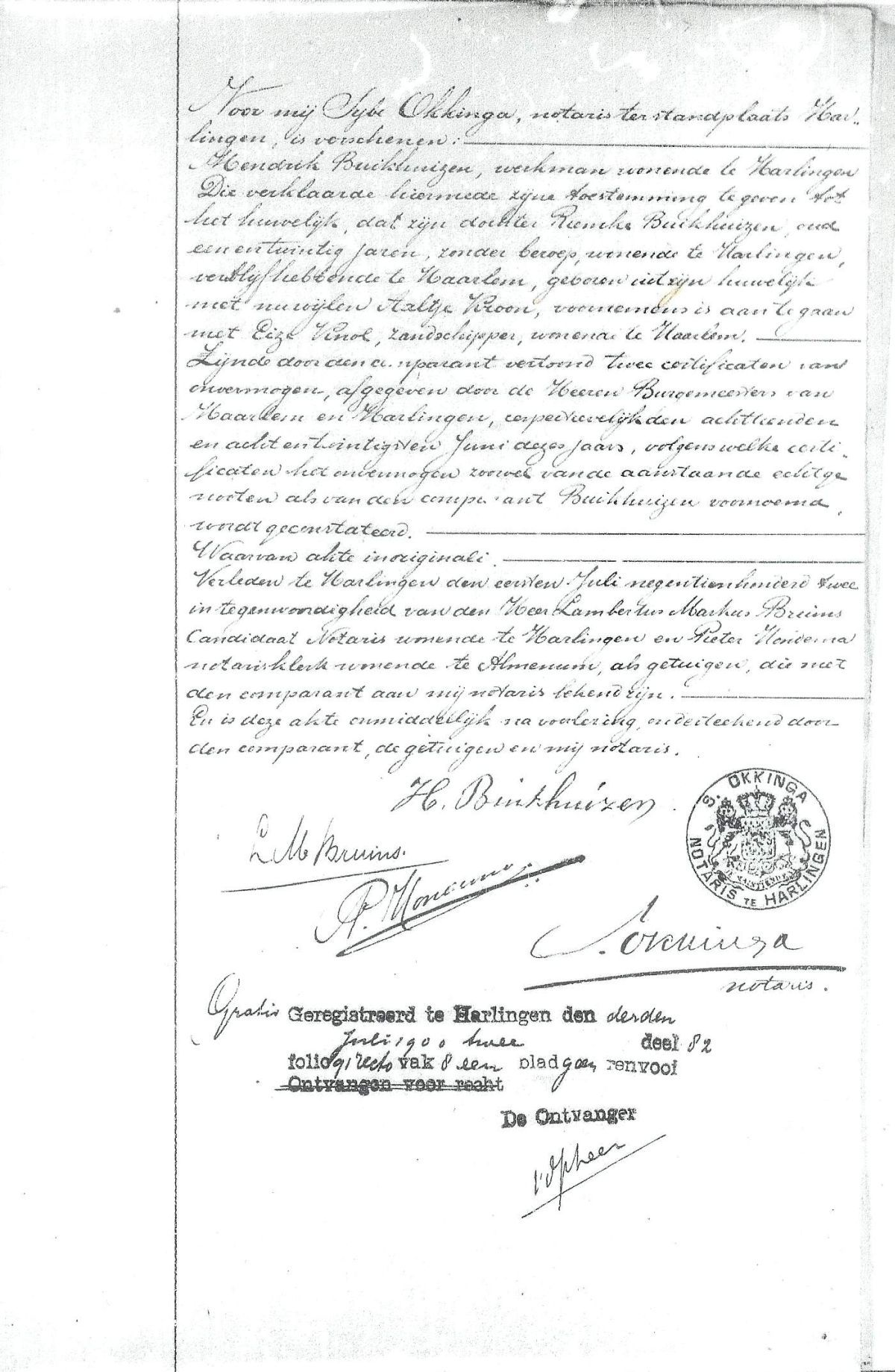 Riemke was 21 jr., zonder beroep, geboren en wonende te Harlingen, meerderjarige