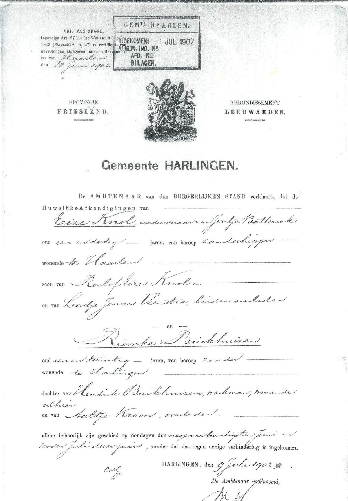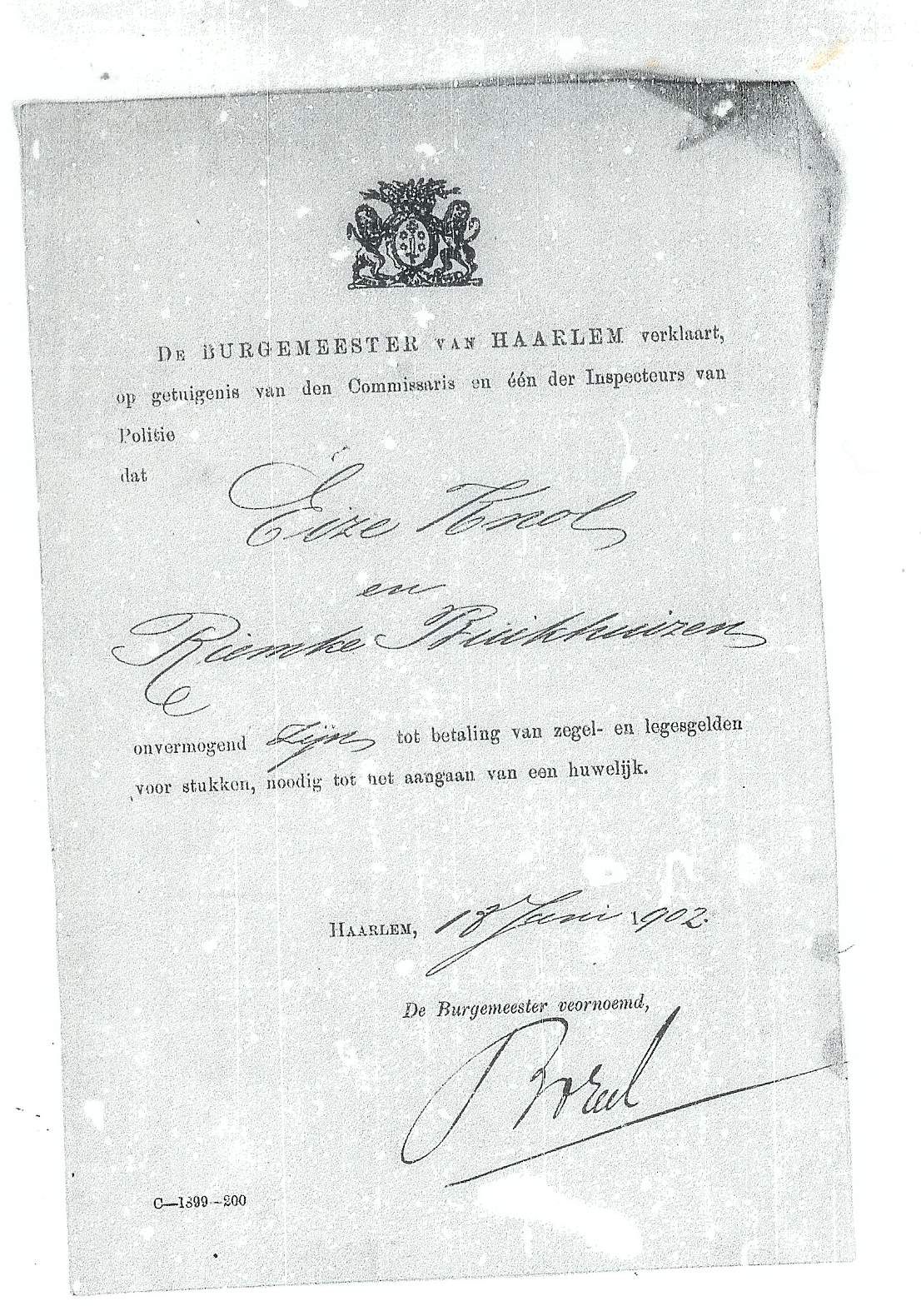 Getrouwd op 30-07-1+02 te Haarlem, in het huis der gemeente verschenen: