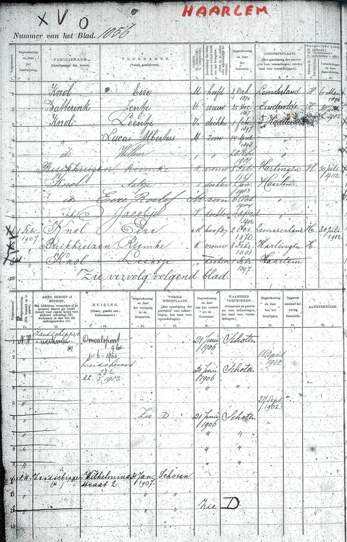 Riemke gaat met haar gezin op 31-01-1907 weer terug naar Haarlem, Wilhelminastraat 2.