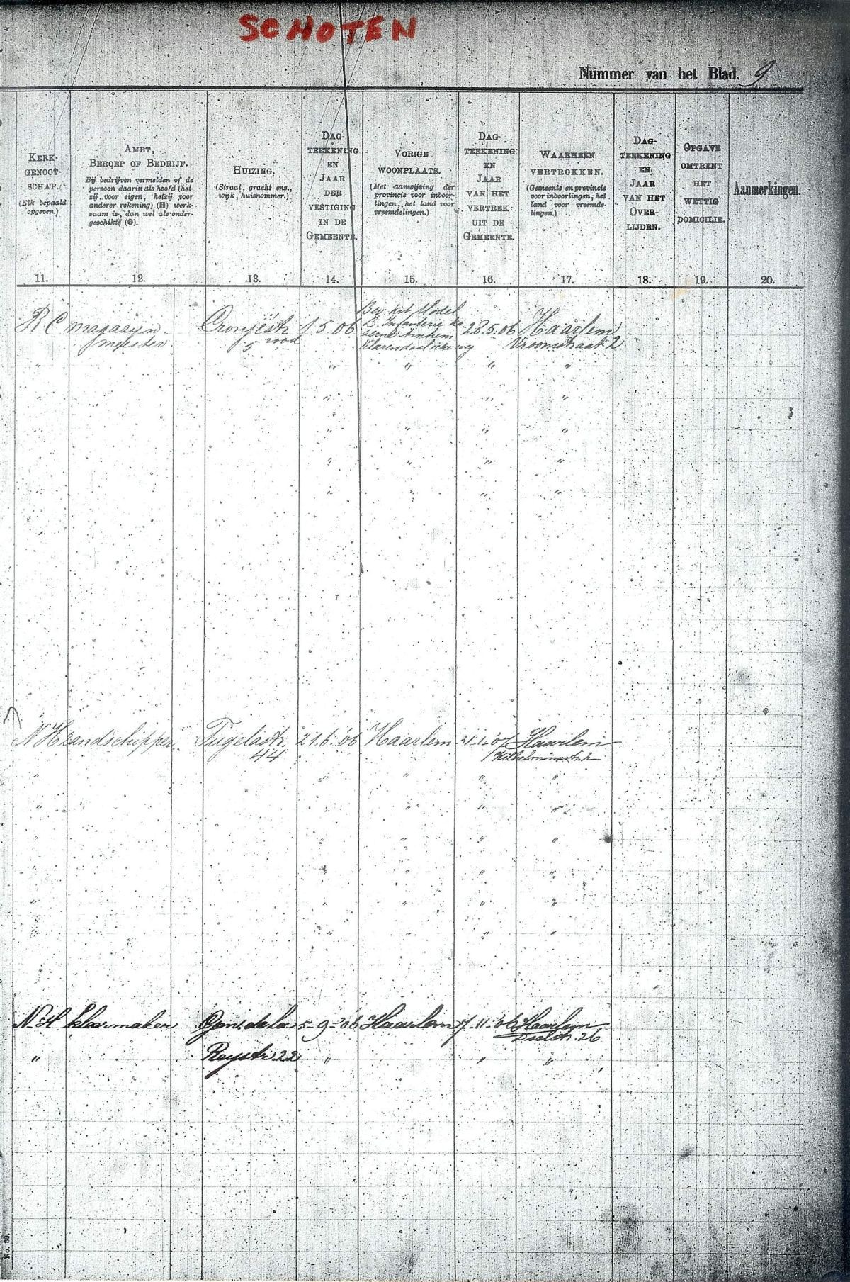 Bev. Reg. Schoten blad 9 (archief Haarlem - Schoten is heden een wijk van Haarlem.)