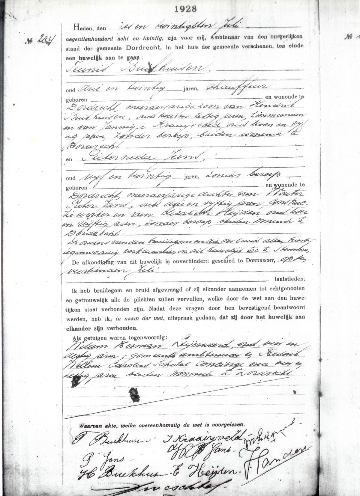 Huwelijksregistger 1928 Dordrecht, akte 284